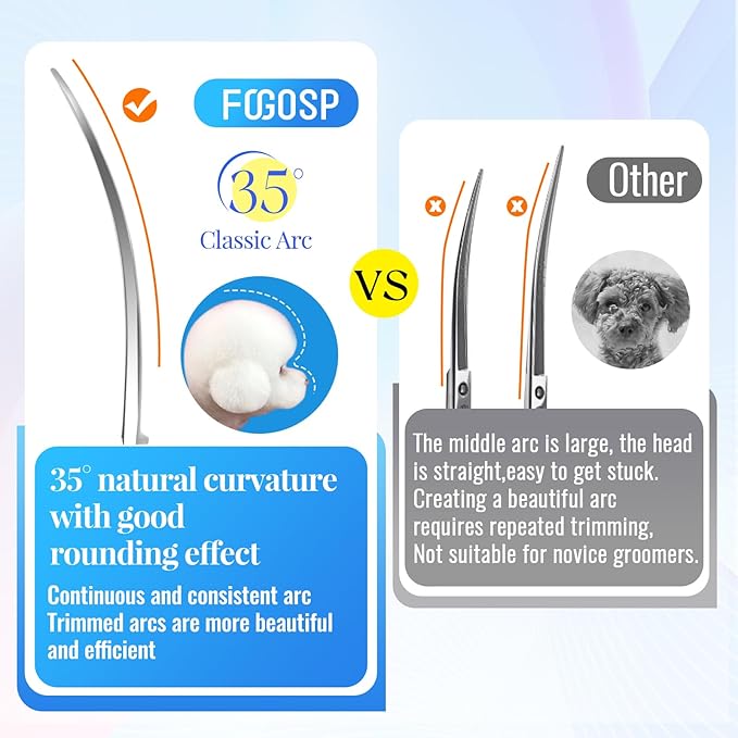 - 35 ° Golden Arc: This curved dog shears allows you to more accurately control the cutting lines and curves during the cutting process, showcasing excellent trimming effects. The curve that ordinary curved scissors need to be trimmed multiple times to achieve, we can handle this small curved scissors with just one cut. Whether you want to trim your dog into cute shapes or trim your cat's fur, you can easily do it.