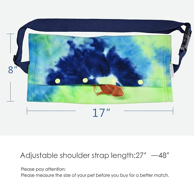 - 【ADJUSTABLE SHOULDER STRAPS】The length of the shoulder straps can be adjusted according to your needs, the adjustable straps are 27-48 inches long, suitable for small to large people. Snap design, easy to put on.There is an adjustment clip on the rope, you can tighten the rope of your reptile to a tight enough level according to the shape of your reptile, so it is also suitable for geckos, crowned geckos, lizards, chameleons, small lizards iguanas and other small animals such as guinea pigs, ferrets, hamsters, rats and other animals which chest girths between 3''~7''.