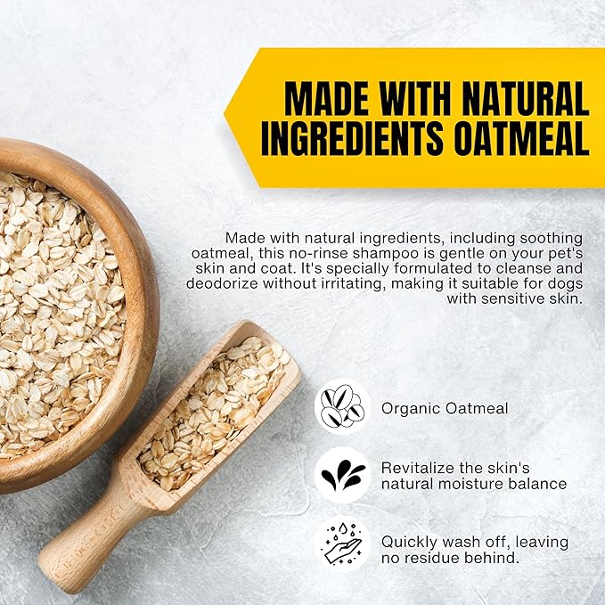 - RINSELESS DOG SHAMPOO: With our waterless shampoo for dogs, grooming your dog becomes a breeze. Simply apply our oatmeal dog shampoo directly to your pet's coat, massage it in, and towel dry. No need to rinse.