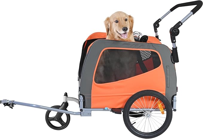 - 2-in-1 Design: This dog bike trailer is your perfect partner for leisurely bike rides and active jogging sessions. It easily transforms from a bicycle trailer to a jogging stroller. It fits most bicycles with wheel diameters of 22-28 inches and can carry up to 66 lbs/30 kg, making it effortless to take your furry companion on adventures.