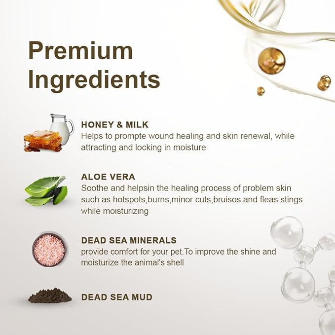 - [Dead Sea Mud and Minerals): Harnesses the natural properties of Dead Sea mud and minerals to gently cleanse and soothe your dog's skin, providing relief from itching, irritation, and inflammation.