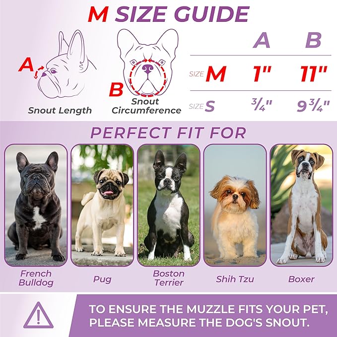 - S / M Sizes Available: Dog muzzle for french bulldog specifically designed for dogs with short snouts, ensuring a comfortable and secure fit. M size pug muzzle for snout length 1" and girth 11".