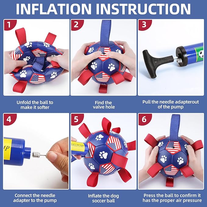 - âš½Pump & Needle Adapter Included: The herding balls for dogs comes deflated. There's a needle point adapter and a pump inside as well while other items in the same market only include a ball needle. The soccer ball dog toy is 8 inches in diameter, perfect for large breeds, not for aggressive chewers.