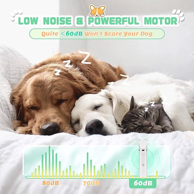 - 【Low Noise Design】The motor of the dog hair clipper has been treated with noise reduction, effectively controlling the working noise within 60 dB. There is no need to worry about the sound during the grooming process scaring the dog. The low-noise grooming environment helps to increase the efficiency of the trimming. That makes it ideal for sensitive and nervous dogs and cats. Our dog trimmer for face give your pets a safe, relaxing and excellent grooming experience!