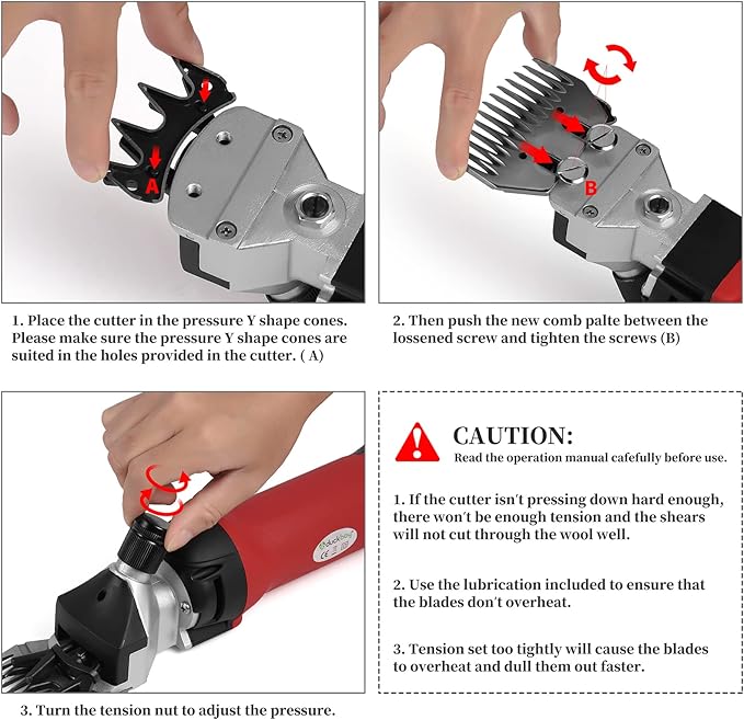 - [AVOID IDLE AND LONG TIME OPERATION]: When using electric scissors, remember to lubricate the blade to avoid long time operation. Quality sheep shears kit will help to use cooling sprays every few minutes and take small breaks otherwise the shears will get overheated. Please read the instructions carefully before use.