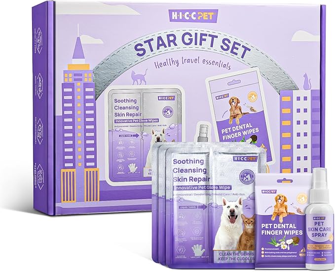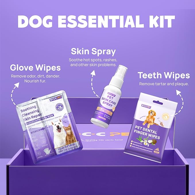 - [Essential Cleaning Care Kit for Dogs] Includes 1 bottle of anti-itch spray, 1 pack of dental wipes (25 pieces), 3 packs of hypoallergenic glove wipes. Designed for pets with skin problems that prevent them from being cleaned. Such as hot spots, allergies, wounds, etc.