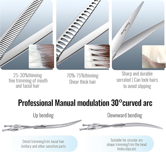 - Features: 7 inches pet shear set with ergonomic handles, suitable for most people. Finely polished, frosted surface, fine metal texture. precise adjustable screws effectively prevents screws from loosening due to prolonged use