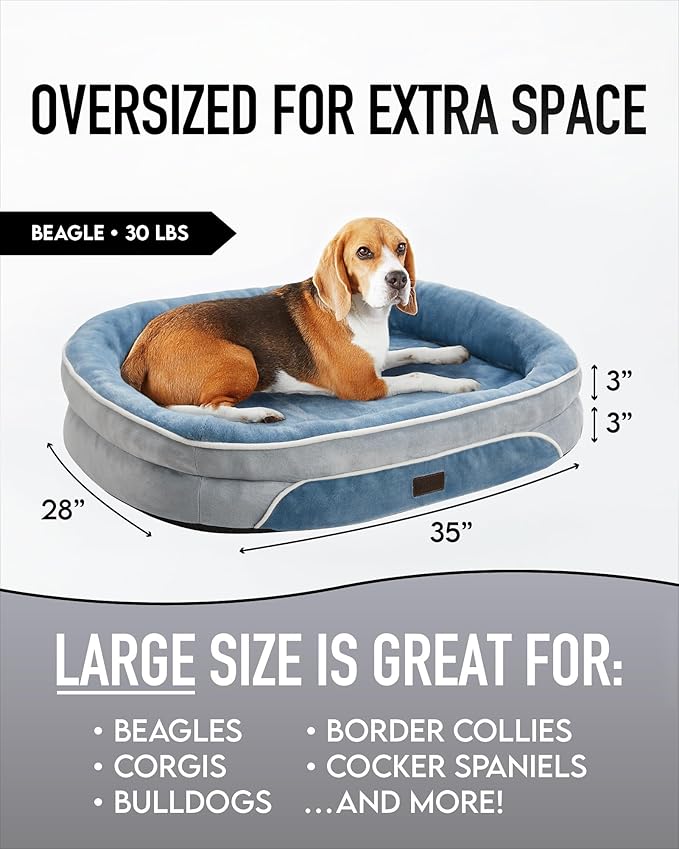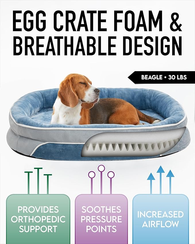 OhGeni Orthopedic Dog Bed for Large Dogs, Dog Couch Design with Egg Foam Support, Removable, Machine Washable Plush Cover and Non-Slip Bottom with Four Sided Bolster Cushion (Washed Blue)