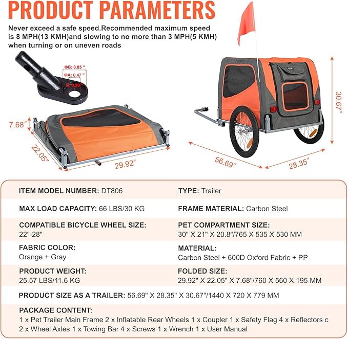 - Designed for Your Bike: Our dog bike trailer is the perfect companion for your bike rides. It easily attaches to most bikes, letting you take your furry friend for a spin. With a load capacity of 66 lbs/30 kg, it's a breeze to transport your beloved pet. Fits bike wheel diameters of 22-28 inches.