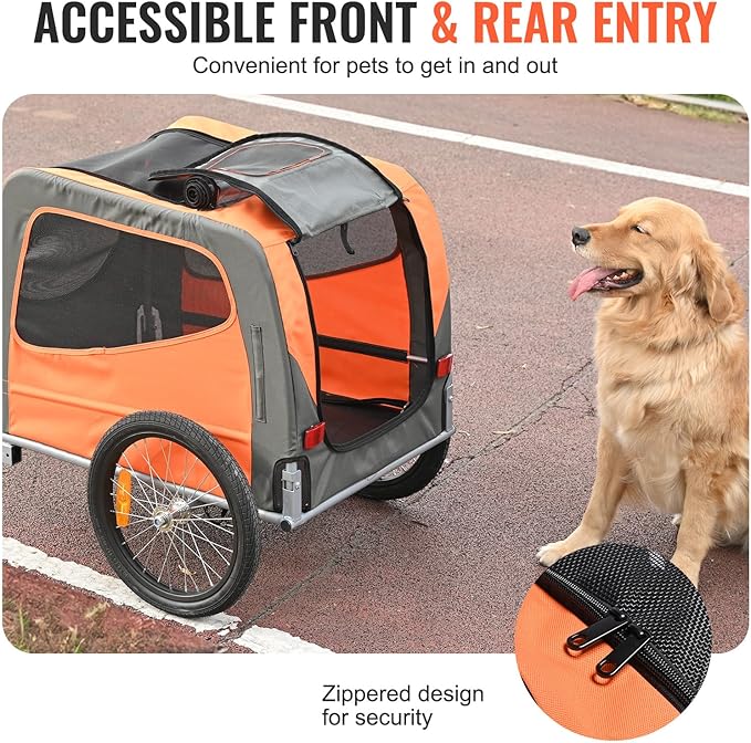 - Easy In, Easy Out: Getting your pet in and out is a breeze with this pet bike trailer. The transparent front door provides protection from wind and rain while ensuring excellent ventilation. Your pet can hop in through the zippered front and rear doors and even stick their head out, all with ease.