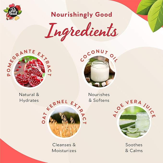 - NATURAL OILS and EXTRACTS – Enriched with pomegranate extracts and coconut oil for hydration, oat kernel extract, and aloe vera to soothe and moisturize the skin; The fresh and subtle pomegranate fragrance appeals to both dogs and humans