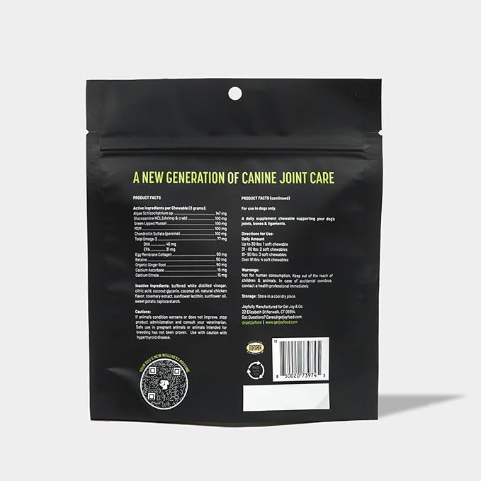 - Contains: (1) 9.5- Ounce Resealable Bag of Get Joy Joint+ Dog Chews (90 Chews) supporting joint and mobility health