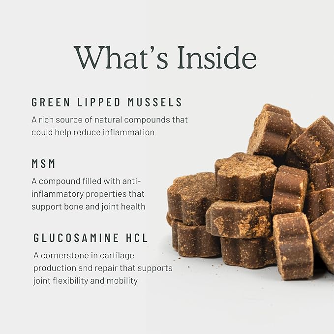 - Dogs Deserve Real Ingredients: We rely on real active and inactive ingredients you can pronounce like Green Lipped Mussels to reduce inflammation, Glucosamine HCl to aid in cartilage repair, and MSM to support bone density. No fillers or additives - just the premium wellness your dog deserves