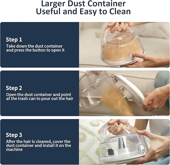 - 5 MAJOR PRO AsyPets UPGRADES:1) Improved air inlet design prevents filter blockage, 2) Strong suction power of up to 13.4Kpa captures 99% of pet hair, 3) Detachable hair clipper for added convenience, 4) Simple one-button cover opening for easy hair disposal, and 5) Extended and detachable hose for unclogging in case of blockage. Get your pet grooming experience now!