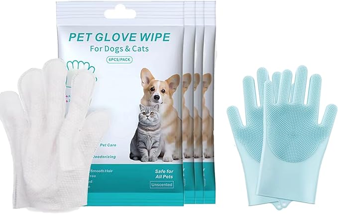 - {Pet Grooming Glove wipes combination}:This Pet Grooming Glove wipes combination comes with a pair of silicone gloves. Before wearing the wipes, please wear the silicone gloves, which can keep your hands dry and massage your pet. During the cleaning process, your pet will be more comfortable and the cleaning effect will be better