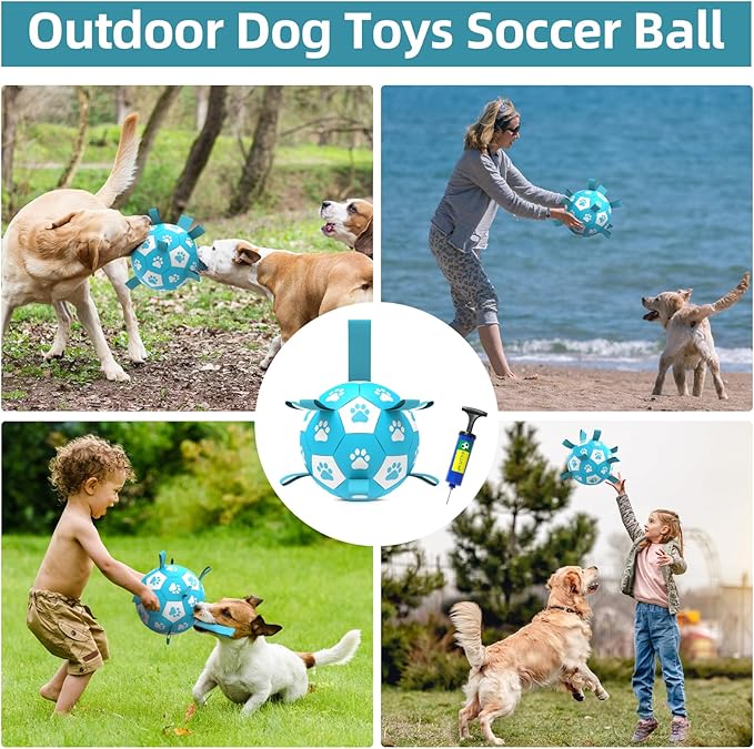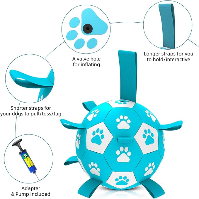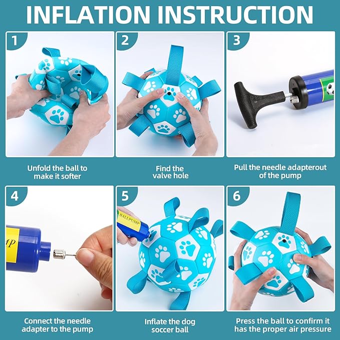 - âš½Pump & Needle Adapter Included: The herding balls for dogs comes deflated. There's a a needle point adapter and a pump inside as well while other items in the same market only include a ball needle. The soccer ball dog toy is 8 inches in diameter, perfect for large breeds, not for aggressive chewers.
