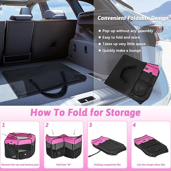 - Simple Setup & Portability: This lightweight dog playpen indoor comes with a carrying bag for easy transport, sets up quickly and folds flat, includes two pockets and a water bottle holder, ideal for travel and camping with no assembly required