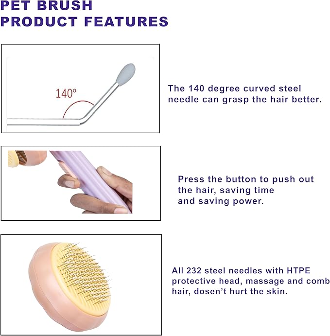 - UPGRADED PET FUR BRUSH - The 140°bent needle is more in line with the standard of safe use for cats, penetrate deep into the undercoat and grasp loose hair easily. This self cleaning cat brush with 232 stainless steel needles with protection points is 1.3 times as thick as bristles of other deshedding brush for cats, more sturdy and not easy to deform, can be used for a longer time. Prevents pet hair static electricity.