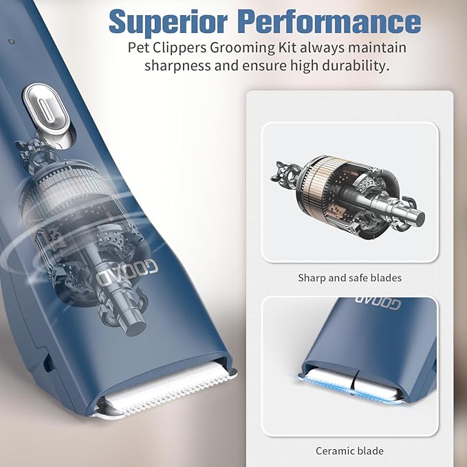 Goood Cat Clippers for Matted & Long Hair - Quiet, Cordless Grooming Kit with Paw Trimmer & Nail Grinder for Cats & Small Pets (Blue)