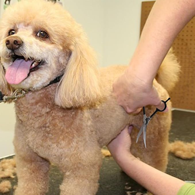 - MULTIFUNCTIONAL - 7 inches curved dog scissors with 3.38 inches blades, the professional curved shears dog grooming are ideal for pet hospital, pet salon, and family to use on dogs, cats and the like. The curved dog scissors blades are especially suitable for grooming the dog eyes, face, ears, paws, head and other sensitive areas.