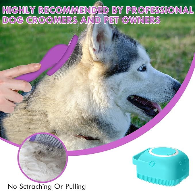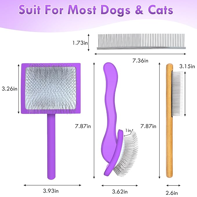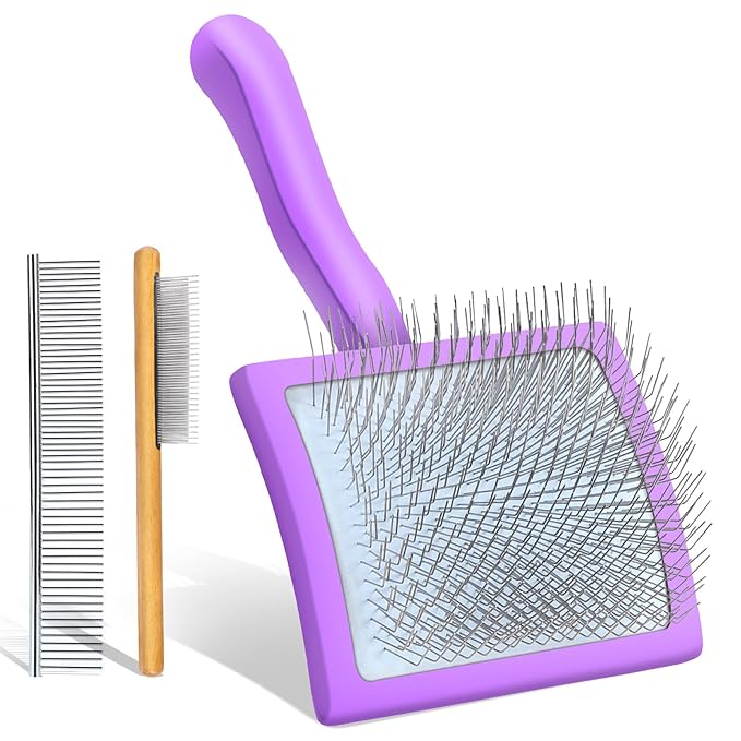 - [Professional Pet Grooming Kit] Effective brush with long, denser, and softer pins, 2-IN-1 detangling handle comb designed with long and short metal teeth groom top coat and undercoat at one time. Wide and narrow teeth comb for loose hair, dander & dirt trapped beneath fur.