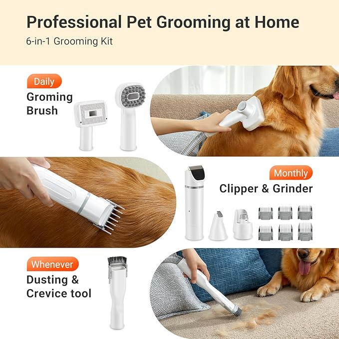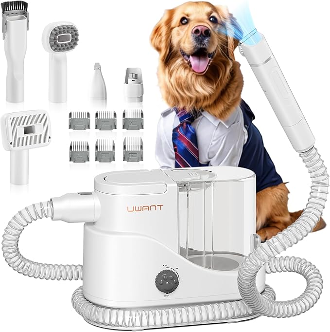 - 【Elevate Your Pet Grooming Game with Uwant】Revamp your pet grooming with the Uwant Dog Grooming Kit, a 6-in-1 vacuum solution for professional results at home. It includes a dog nail grinder, pet paw trimmer, grooming brush, electric clippers with stainless steel blades, a dusting and crevice tool for cleanup, and a massage brush. Avoid groomer visits and get salon-quality grooming at your convenience with Uwant.