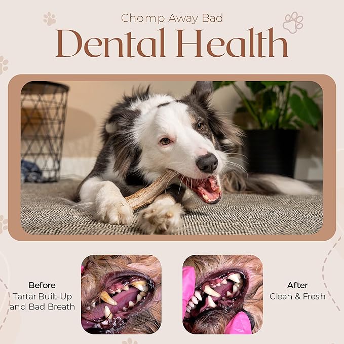 - Dental Health: Chewing on deer antlers can help promote dental health by reducing plaque and tartar buildup on your dog's teeth. The chewing action also helps massage the gums, which can contribute to overall oral hygiene.
