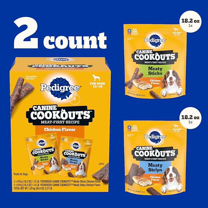 - Contains one (1) 36.4 oz. Multipack Box of Pedigree Canine Cookout Soft Dog Treats, one (1) 18.2 oz. Pack of Chicken Flavored Meaty Sticks and one (1) 18.2 oz. Pack of Chicken Flavor Strips.