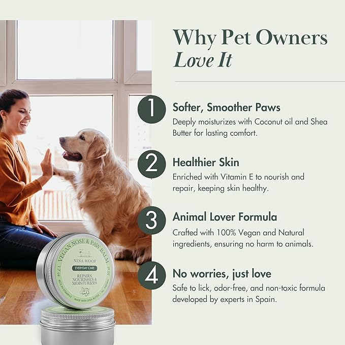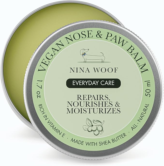 - All-Natural Vegan Nose & Paw Balm: Our dog nose balm for dry nose and paw balm is crafted with vegan ingredients. It's rich in Vitamin E, providing deep nourishment and healing properties for your pet's sensitive skin.