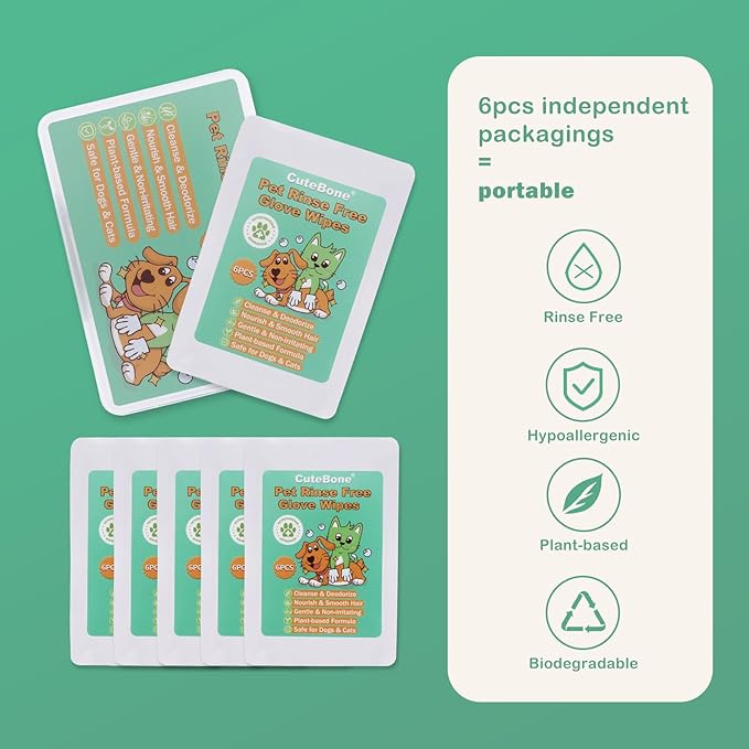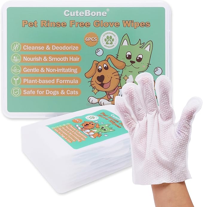CuteBone Pet Glove Wipes - Dual-Sided Grooming Gloves with Wipes, Gentle and Effective Cleaning for Dogs, Removes Dirt, Fur, and Dander, Convenient and Mess-Free Grooming Solution, 6 Count