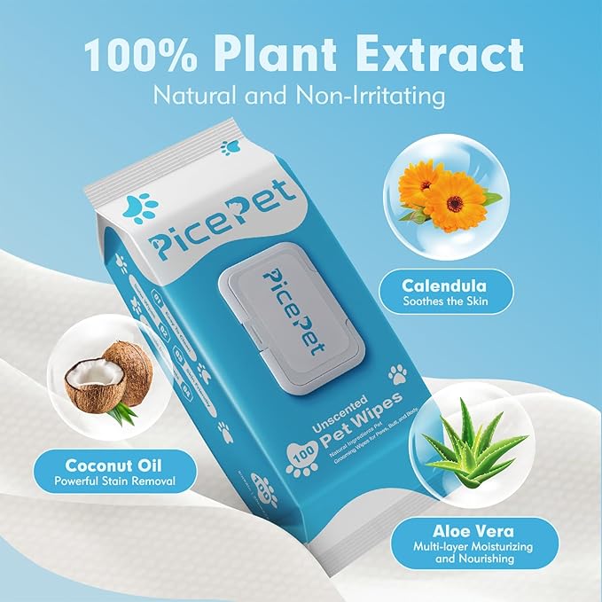 - ORGANIC INGREDIENTS: PICE PET dog wipes are infused with organic purified water, water-spun nonwoven fabric, coconut oil, aloe vera juice, oat extract, cucumber, calendula, vitamin E, and other nourishing ingredients, gently cleansing and conditioning your pet's fur and skin.