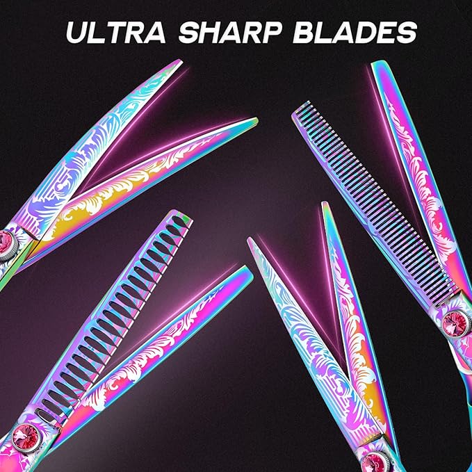 - 4-In-1 DOG GROOMING SCISSORS SET– This dog grooming shears set includes a 7" straight dog shear, 7" curved shear, 7" dog thinning shear, and 7" dog chunker, allowing you to handle all coat types, lengths, and styles with ease. Achieve salon-quality finishes at home or in your grooming studio.
