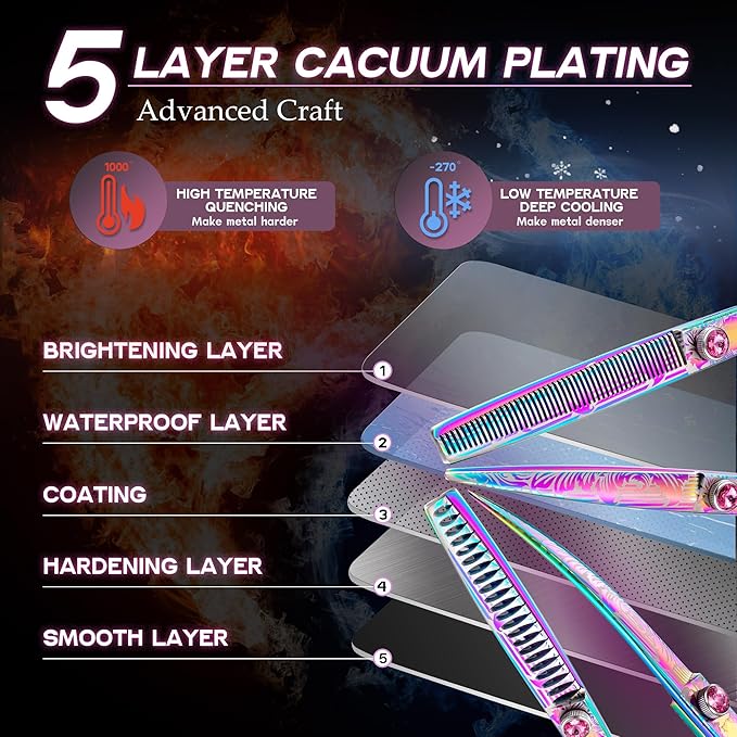 - ULTRA SHARP BLADES - Engineered with Japanese 440C Stainless Steel , each blade has a convex edge and hollow-ground design for smooth, snag-free cutting. The smooth tips ensure safety for both groomer and pet.