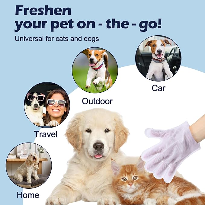 - Versatile Use: Pet glove wipes for dogs ideal for busy owners, pets afraid of water, post-surgery pets, and during travel or cold weather. These cat cleaning gloves offer a quick and convenient cleaning solution when bathing is not feasible. Perfect for a hassle-free trip with your pet.