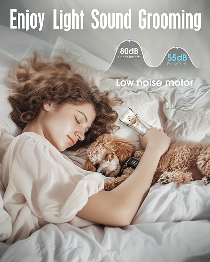 - 【Safe & Effective & Low noise】Essiontech grooming kit for dogs or cats at home is safe and effective.The pet clippers is made of Max-Powerful Motor and Whisper-Quiet Technology.7000 rpm of motors works better for thick coats by reducing the possibility of pulling hair,and which can truly realize rapid shaving.The working noise is lower than 55db. Low noise won't make your fur baby scared and you’ll be able to trim its coat with ease and much faster!In addition, upgrade stainless steel fixed blade and ceramic moving blade can provide excellent cutting performance. The blade sharp enough for a long time using. Detachable blades,easy to change and clean.