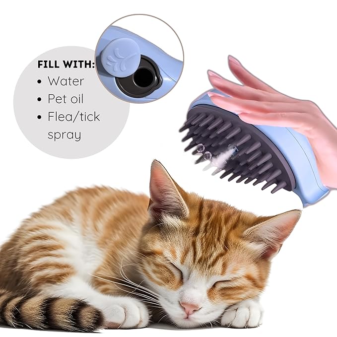 - 💧 Easy to use - Simply fill with water or dilute with pet oil or bug sprays, and turn on to allow a mist. USB cord included to recharge the steamy cat brush. Battery time lasts about 1 week.