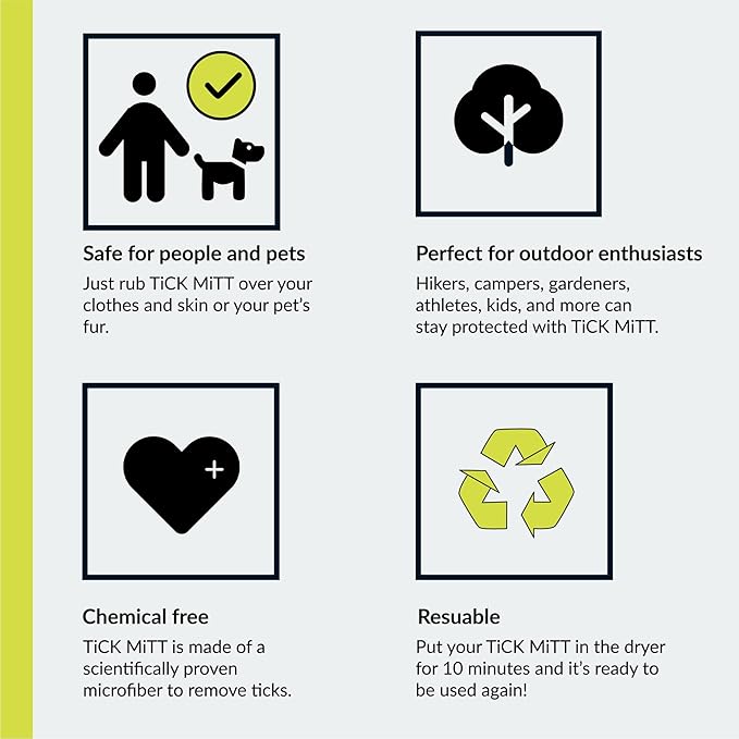 - CHEMICAL-FREE TICK REMOVAL FOR EVERYONE: Enjoy a natural and safe tick removal solution for your whole family. The TiCK MiTT is a chemical-free alternative to harsh sprays and shampoos, offering peace of mind for you, your children, and your pets. It’s the perfect dog tick remover!