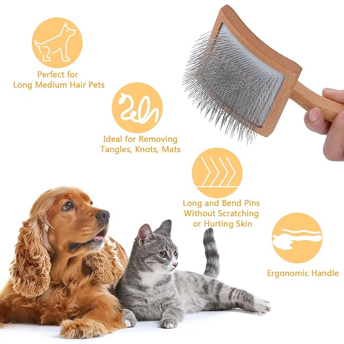 - 【Dog Slicker Brush Set】You will receive 1 PCS dog slicker brush with long, denser, and softer pins, 1 PCS Wide and narrow teeth comb for loose hair, dander & dirt trapped beneath fur, 1 PCS 2-IN-1 detangling handle comb designed with long and short metal teeth groom top coat and undercoat at one time.