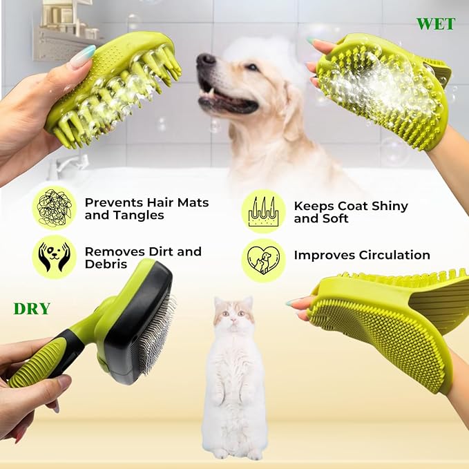 Self Cleaning Slicker Brush for Dogs Cats plus Rubber Pet Bath Brushes for Grooming, DeShedding, Massage & Skin Care - Pet Silicone Shampoo Brush for Long & Short Hair Small Large Pets Dogs