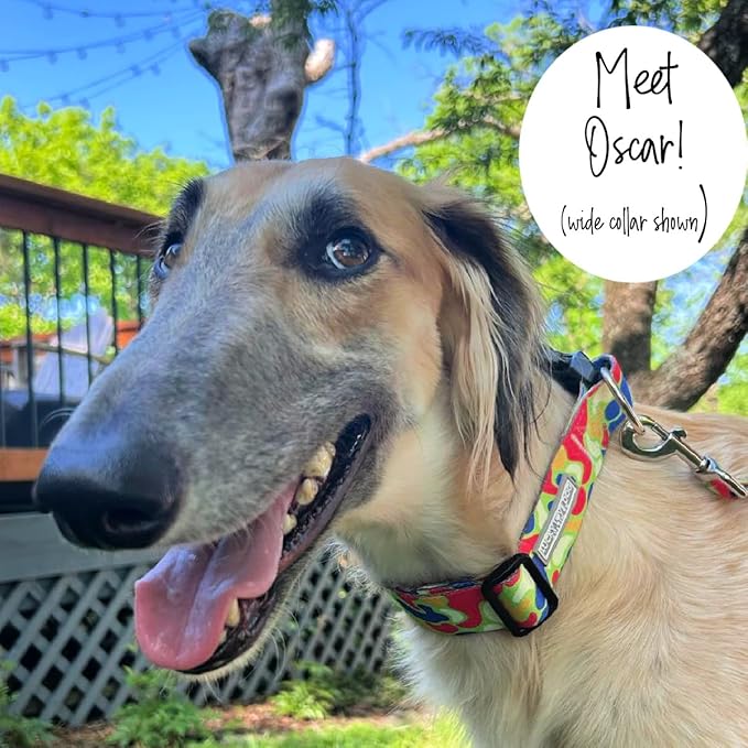 Lucky Love Dog Wide Dog Collar - Adjustable, Durable, Soft Webbing, & Comfortable 1.5 inch Wide Collar for Dogs Male and Female - in Oscar Pattern with Strong Buckle, Medium Size