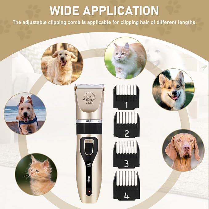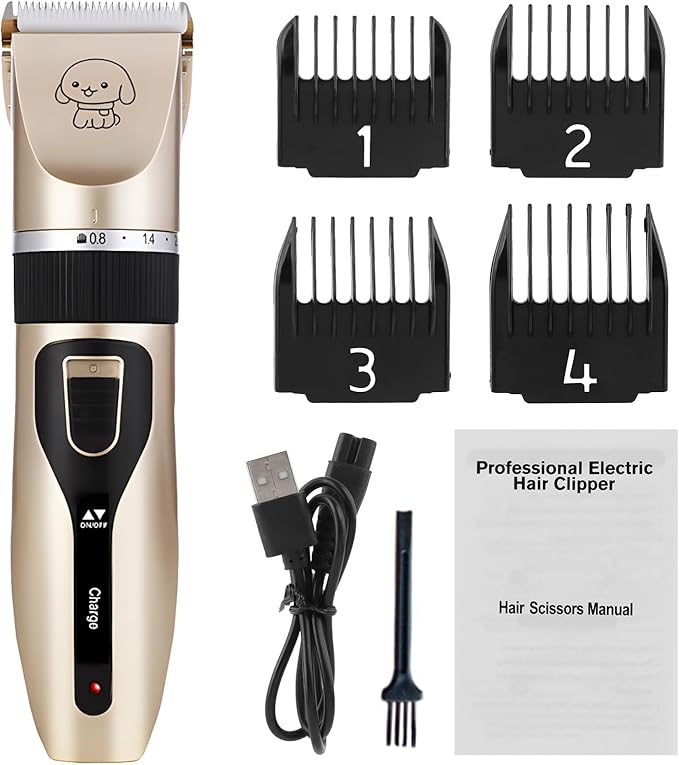 Pilarmuture Dog Grooming Clippers, Dog Hair Clipper with 4 Guard Combs, Low Noise Rechargeable Electric Cat Shaver Shears Tools for All Pets, Dog Trimmer for Grooming, Dog Shaver, Gold