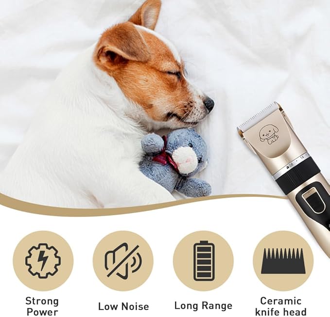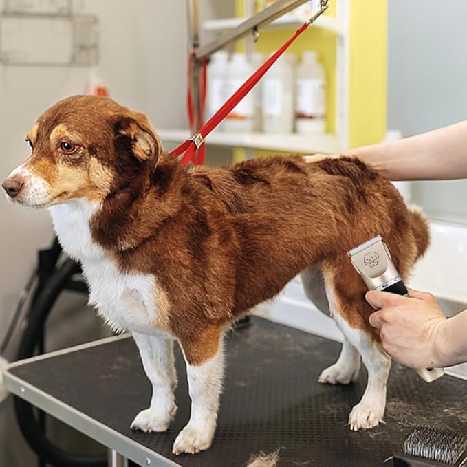 - 【Low Noise】Utilizing a full metal body, our dog clippers offer lower noise and vibration compared to common plastic models on the market. The metal construction reduces vibration, thereby minimizing noise levels to under 50dB, so your pet won't get scared and you'll be able to trim its coat with ease and much faster, Ideal for noise sensitive dogs.