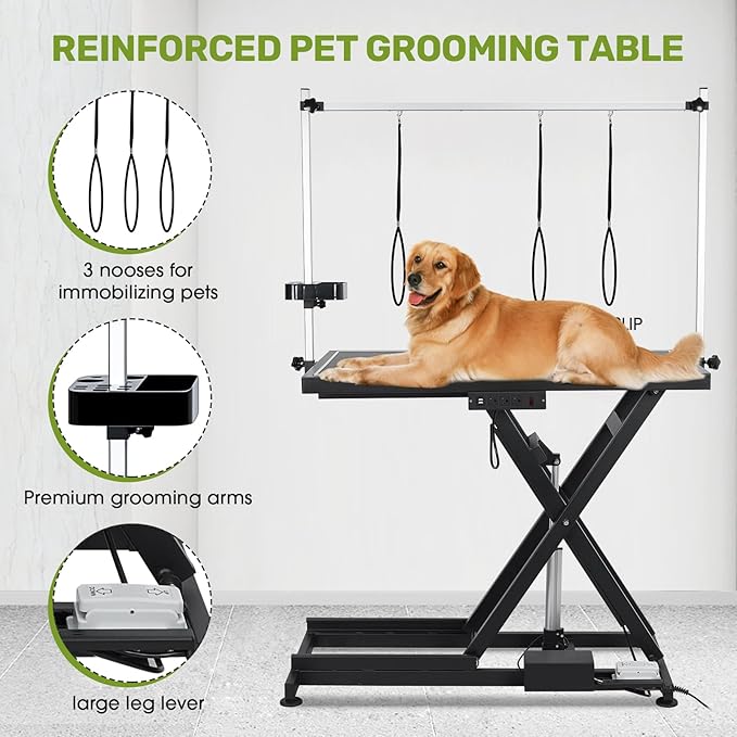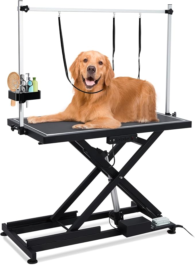 - [Fusional&Convenient Feature]Our dog grooming station complete accessories included:1 * foot controller, 3 * beauty rope, 2 AC Outlets with USB ports, 1 * Tool Storage Organizer.Our table comes with the required instructions and hardware and is easy to set up, helping you save a lot of time and effort.