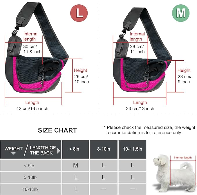 - SIZE AND PETS --- WEIGHT LIMIT 12lbs. The size of this dog carrier is suitable for small dogs, such as Cats, Chihuahua, Yorkshire Terrier, Pomeranian, Mini Poodle, Miniature Schnauzer, Teddy cups etc. Please measure your pet's weight and size before purchasing, and refer to our size chart, this may provide a good help for you to choose our pet carrier sling bag.