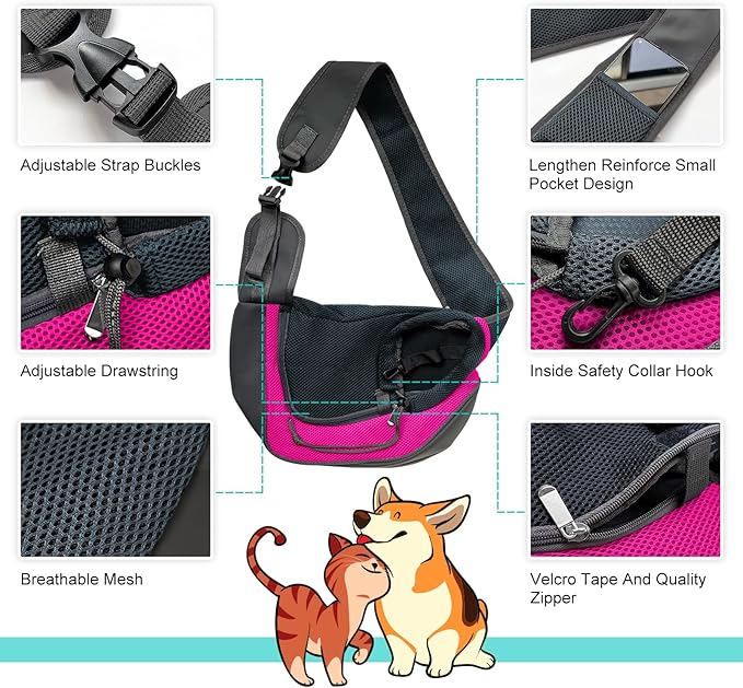 - SAFE AND CONVENIENT --- A safety buckle on the inside of the pet sling carrier (it can be connected to a collar) to prevent pets from jumping out. Magic sticker prevents the zipper from slipping and effectively increases safety. The firm buckle design on the shoulder strap is convenient to use and prevents the bag from being disconnected during use.