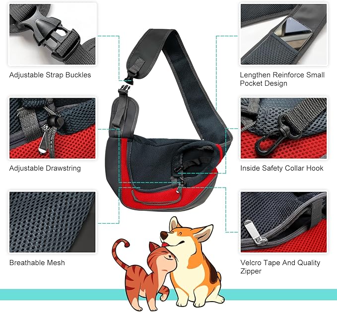 - SAFE AND CONVENIENT --- A safety buckle on the inside of the pet sling carrier (it can be connected to a collar) to prevent pets from jumping out. Magic sticker prevents the zipper from slipping and effectively increases safety. The firm buckle design on the shoulder strap is convenient to use and prevents the bag from being disconnected during use.