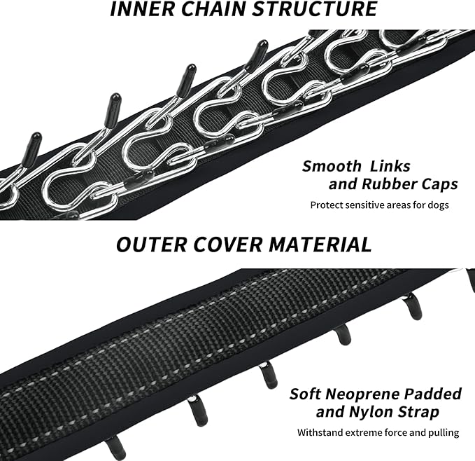 - 🐾【Strong & Durable Material】The inner chain of No Pull Dog Collar is made of stainless steel links, rust-proof and waterproof. Outer cover design with Full Surround Soft Neoprene Padded and Nylon Strap, which can withstand extreme force and pulling power. Combination of two layers adds extra safety to prevent Anti Pull Dog Collar from falling apart, more sturdy and durable.