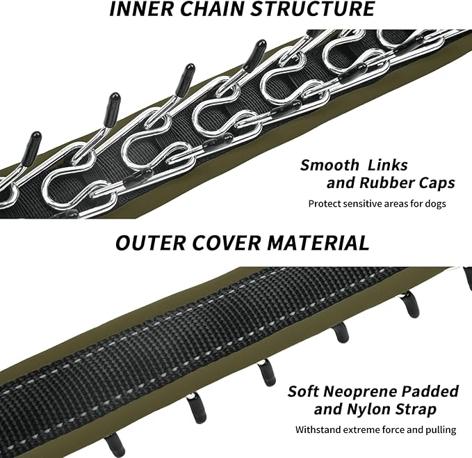 - 🐾【Strong & Durable Material】The inner chain of No Pull Dog Collar is made of stainless steel links, rust-proof and waterproof. Outer cover design with Full Surround Soft Neoprene Padded and Nylon Strap, which can withstand extreme force and pulling power. Combination of two layers adds extra safety to prevent Anti Pull Dog Collar from falling apart, more sturdy and durable.