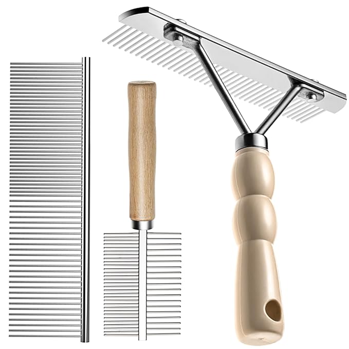 - 3 in 1 Long-haired Pet Grooming Kit: For pets with long and thick hair, shaving is not the best choice. Proper combing can keep the hair at its maximum fluffiness. The thick-haired pet grooming kit includes a wide-tooth rake comb, a double-density detangling comb and a flea comb, which is very suitable for daily combing of pets with double coats.