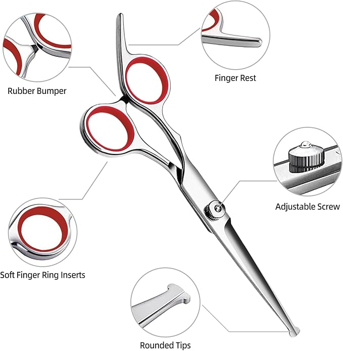 - Multifunctional Pet Grooming Tool Set:1*Straight Scissors, 1*Curved Scissors, 1*Thinning Shears,1*Nail Scissor,1*Nail File, 1*Cleaning Cloth, 1*Black Storage Leather Case.